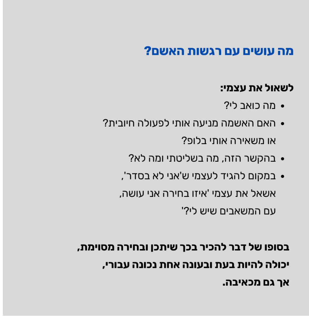 "לא תמיד אפשר לשחרר אותם. כדאי להתבונן בכאב לעומת האשמה. אשמה בדרך כלל לא מניעה אותנו לפעולה חיובית – לרוב היא משאירה אותנו בתוך הלופ. כשמרגישים אשמה יש מקום לשאול: מה כואב לי? והאם האשמה עוזרת? מה בשליטתי ומה לא?