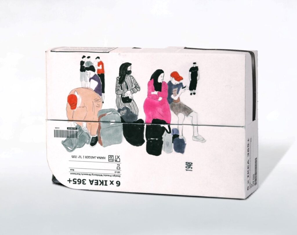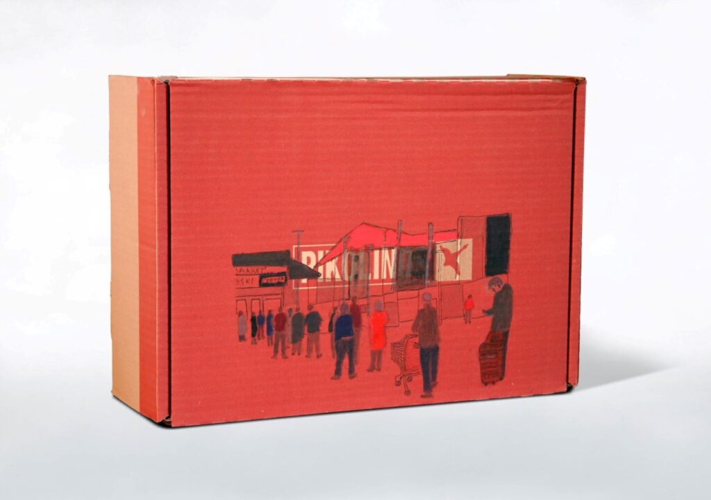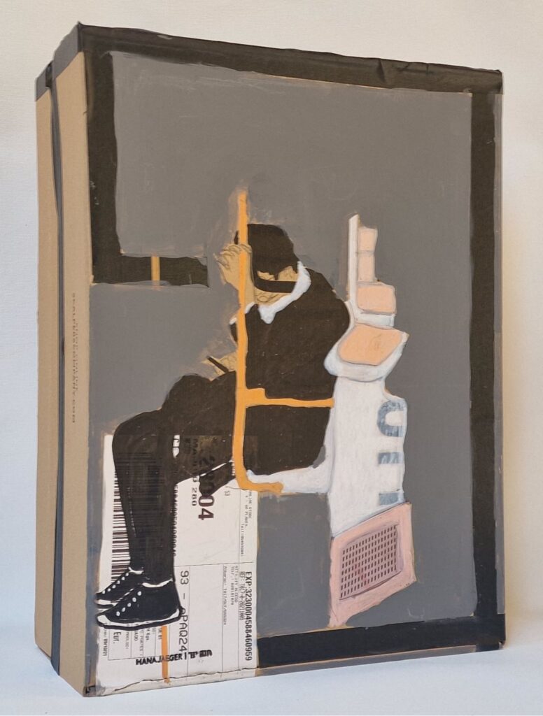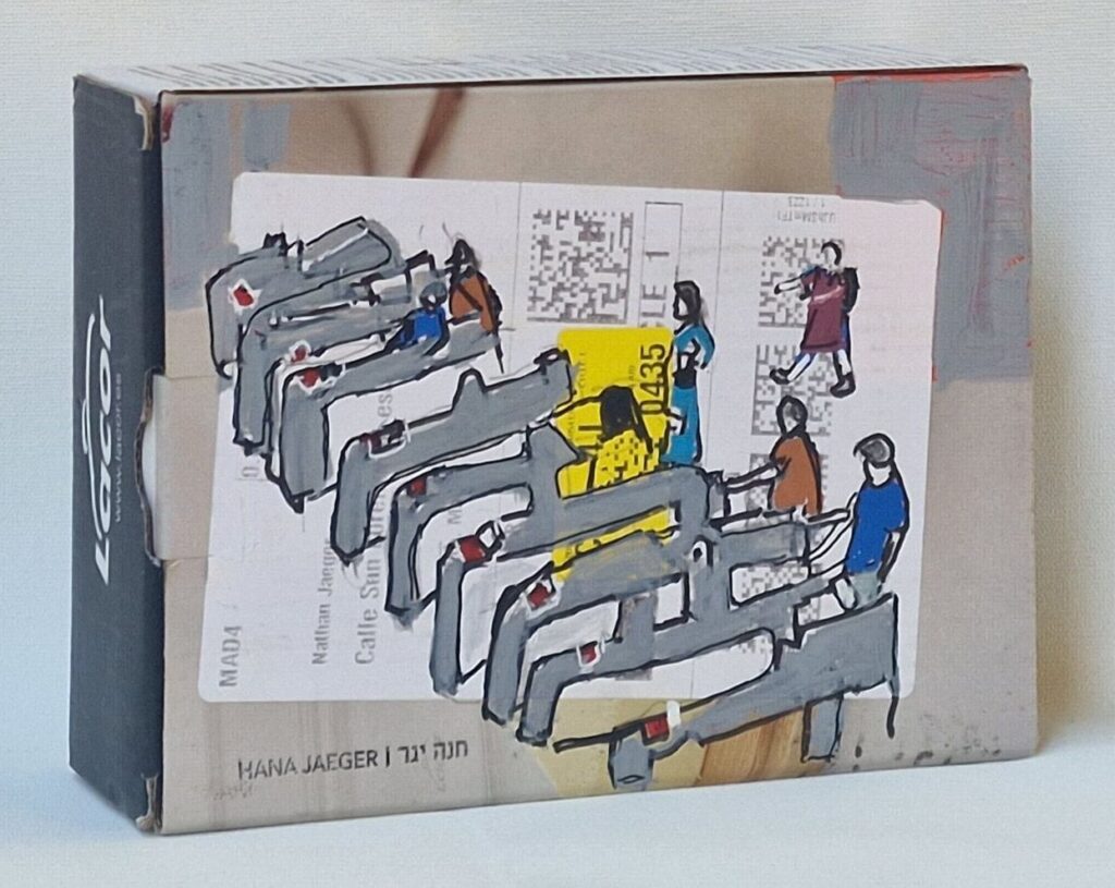 גם בחירותיה החומריות פועלות באותו היגיון. יגר משתמשת במה שנמצא בהישג יד – קופסאות קרטון, חוברות הוראות הרכבה של איקאה, ניירות זמניים, חומרים שלא נועדו להישמר. הם מחזקים את תחושת הארעיות, את הצורך לפעול מהר, לפני שהרגע נעלם. לפעמים קשה להבחין מה כבר היה שם ומה נוסף. כמו בעיר עצמה, שבה הכל, כל הזמן בתנועה.