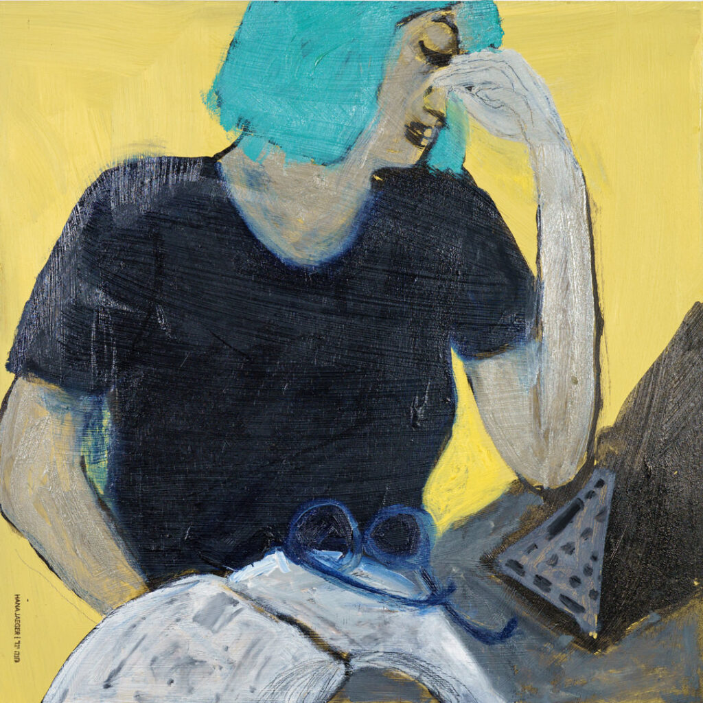 הדמויות בעבודות של יגר אינן פונות אל הצופה. לעיתים נראה רק גב, כתף או ראש שמוט; לעיתים הפנים מטושטשות או נעלמות לגמרי. אלו אנשים שנתפסו באמצע, בין תחנה לתחנה, בין תור שזז לאחד שעומד, בין ערות לעייפות.